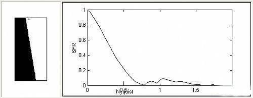 新名詞 SFR!Spatial frequency response (SFR) 主要是用於(yu) 測量隨著空間頻率的線條增加對單一影像的所造成影響。簡言之SFR就是MFT的精簡版。因為(wei) 測量MFT需取得昂貴的正弦樣版,並且需換算大量的數據。因此,PIMA開發了這款 較低成本的SFR作為(wei) 替代品。基本上SFR隻需一個(ge) 雙色調的黑白斜線(如下左圖所示)即可換算出約略相等於(yu) MFT的值的解像力評鑒圖。