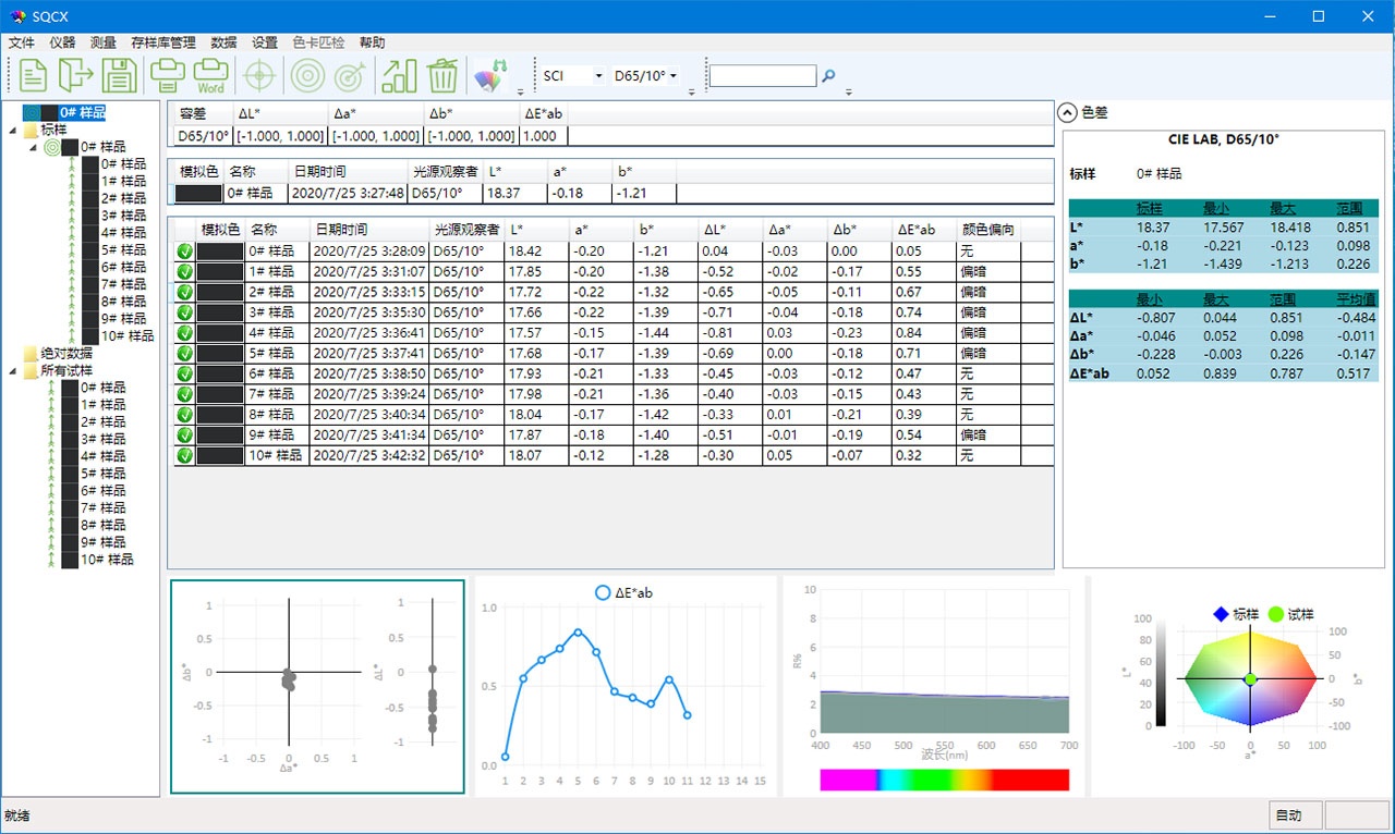 光譜圖/數據,樣品色度值,色差值/圖,合格/不合格結果,顏色仿真,顏色偏向 |